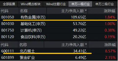 资金面上,超百亿主力资金狂涌!有色金属板块上午获主力资金净流入超109亿元,高居31个申万一级行业首位!北方稀土获主力资金净流入34.41亿元,霸居A股吸金榜首位!紫金矿业亦获主力资金净流入6.49亿元!